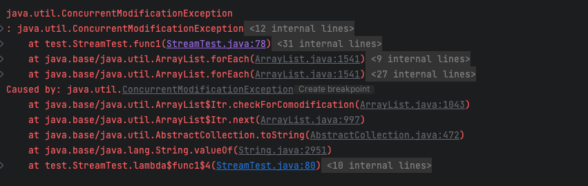 위 코드는 1부터 100까지의 수 중 50보다 큰 수를 병렬 처리를 사용해 matched 변수에 담아서 크기를 보여주는 코드이다. forEach에서 해당 연산을 수행하게 되면 어떤 쓰레드가 어떤 숫자부터 어떤 숫자까지 탐색한다는 보장이 없다. 또한 실행할 때 마다 결과가 달라질 수 있다. 쓰레드에 따라 값이 제각각일 뿐 아니라 추가되는 순서도 다르다. 결국 ConcurrentModificationException이 발생한다.