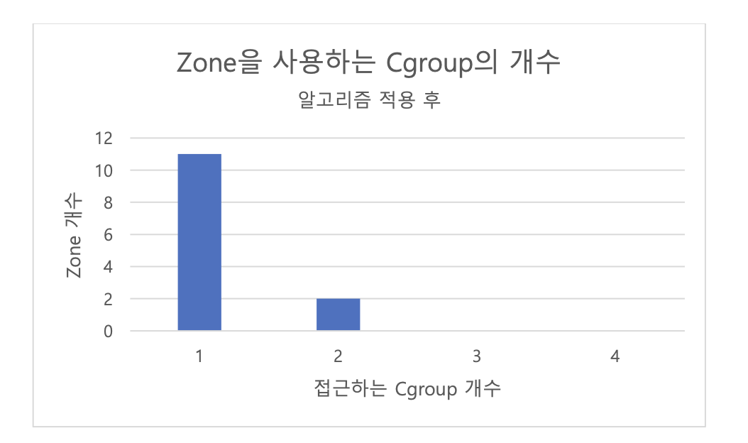 알고리즘 적용 전에는 여러 개의 cgroup이 하나의 zone에 접근하는 경우가 많았음을 알 수 있습니다. 적게는 2개부터 최대 4개의 cgroup이 하나의 zone에 접근하여 I/O 간섭이 발생합니다.