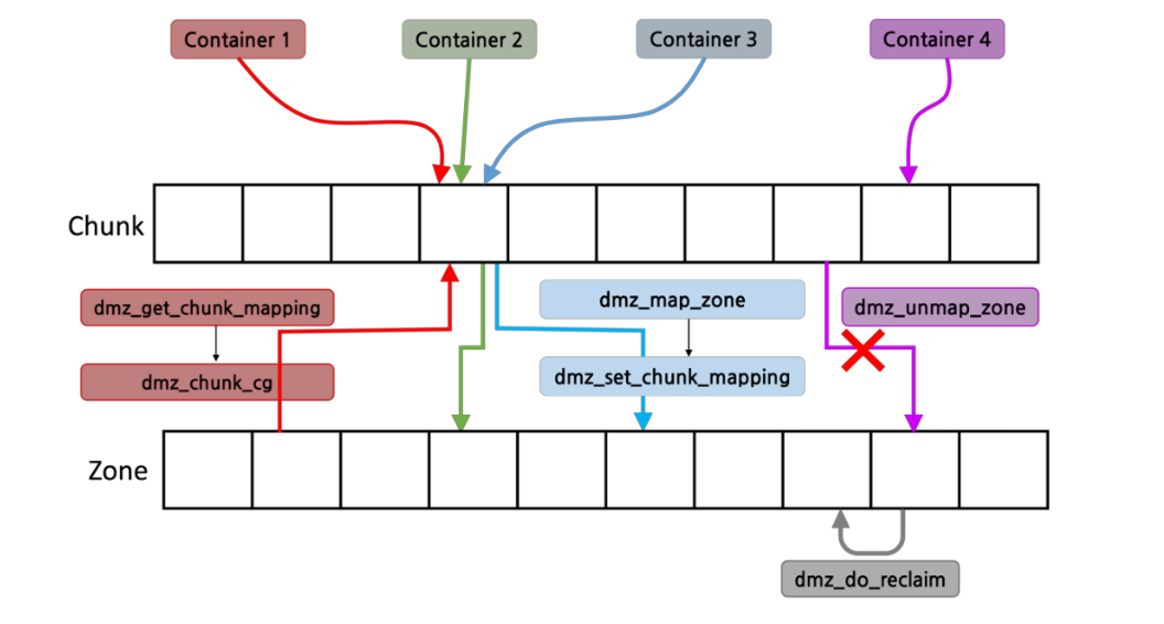 dmz_handle_bio를 통해 chunk에 bio 요청이 들어오면 dmz_get_chunk_mapping 함수는 dmz_chunk_cg를 호출해 cgroup에 할당된 zone id를 찾을 수 있는 index를 얻습니다. 만약 매핑된 zone이 없다면 dmz_map_zone 함수를 호출하고 dmz_set_chunk_mapping을 이용해 비어 있는 zone을 할당합니다. 매핑된 zone이 있는 경우 해당 zone을 가져와서 사용합니다. 사용이 끝난 zone은 dmz_unmap_zone 함수로 unmap 시켜줍니다. 만약 reclaim 요청이 들어올 경우 dmz_do_reclaim 함수가 해당 zone을 unmapping 하고 새로운 zone을 매핑합니다.