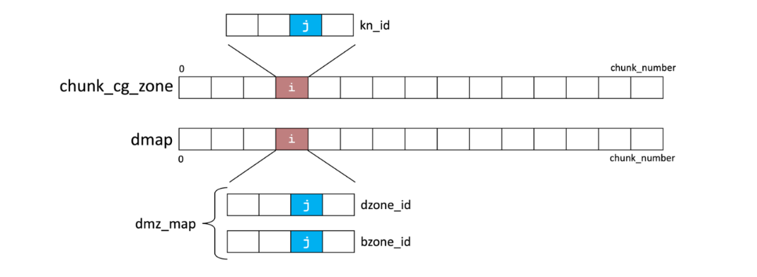 dmz_map 구조체는 chunk_id를 인덱스로 하는 dmap 배열의 엔트리입니다. 해당 chunk에 매핑된 dzone_id와 bzone_id 값을 가지고 있는데, 이를 크기 4의 배열 형식으로 수정하여 하나의 chunk당 4개(1:N)의 zone_id를 저장할 수 있도록 변경했습니다.
