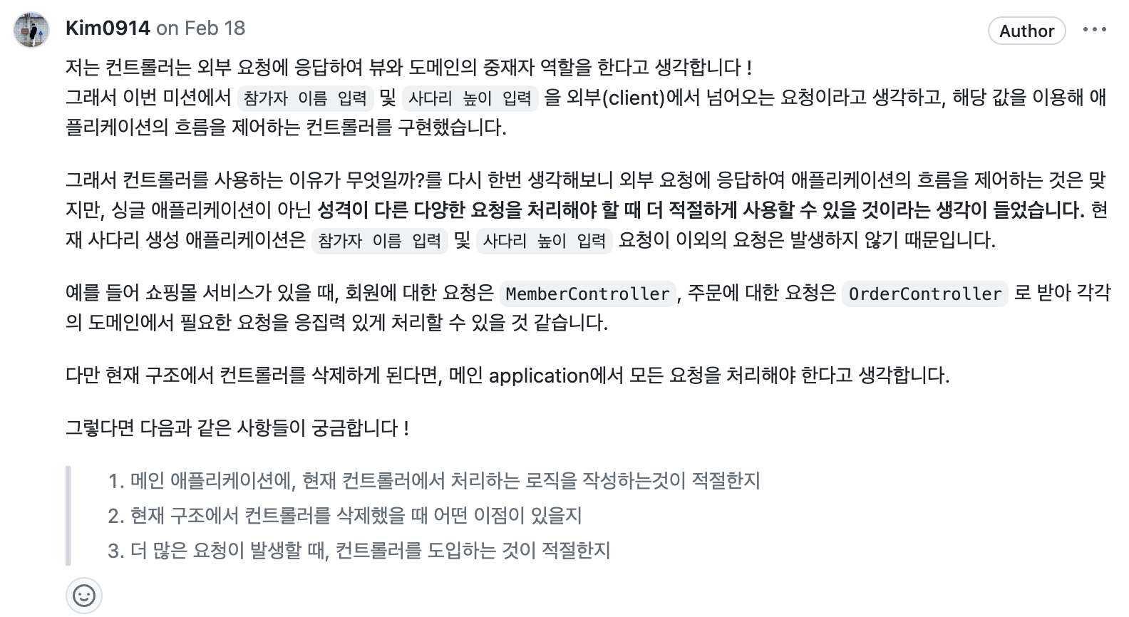 MVC 패턴을 적용한다는 생각에 사로잡혀 각각의 Layer에 대한 책임을 명확히 하지 않고, 도입하는 명확한 기준도 없이 사용하고 있다는 점을 깨달았습니다. 결론적으로 레벨 1의 목적인 도메인에 집중하지 못하고 있었습니다. 컨트롤러는 도메인이 많아지고 요청에 대해서 처리해야하는 것들이 구분되기 시작된다면 도입하는 것이 적절하다는 기준을 세웠고, 현재 사다리 게임에서는 컨트롤러의 로직을 메인 애플리케이션으로 이동시켰습니다.