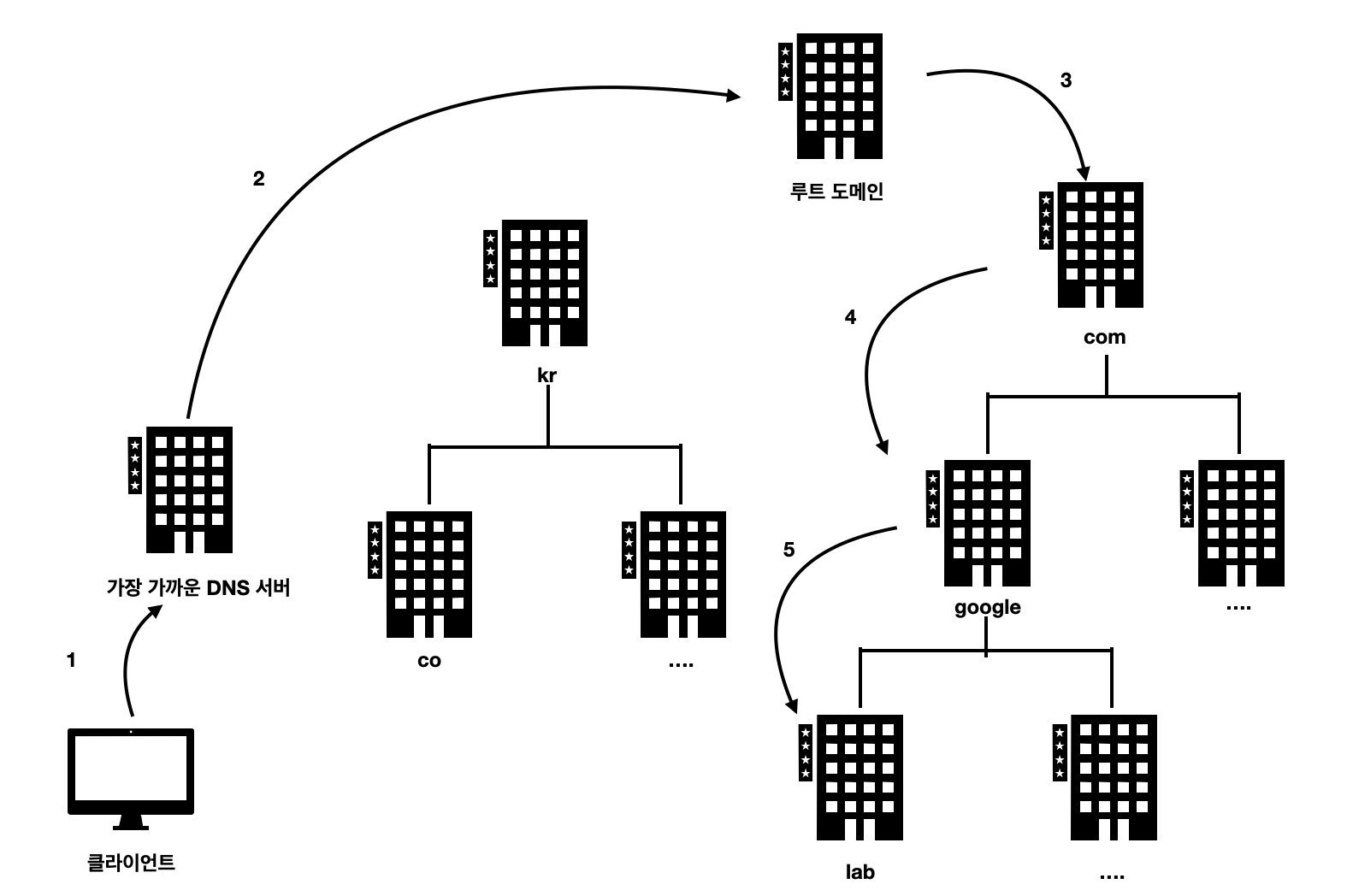 lab.google.com 이라는 웹 서버에 관한 정보를 조회한다고 하자. 가장 가까운 DNS 서버에는 lab.google.com이라는 이름이 등록되어 있지 않으므로 루트 도메인으로 이동한다. 이 과정에서 모든 DNS 서버에는 루트 도메인의 DNS 서버가 등록되어 있으므로 거기에 클라이언트로 받은 요청 메시지를 전송한다. 여기서 가장 가까운 DNS 서버란 사용자에게 물리적으로 가까운 위치를 의미한다.
