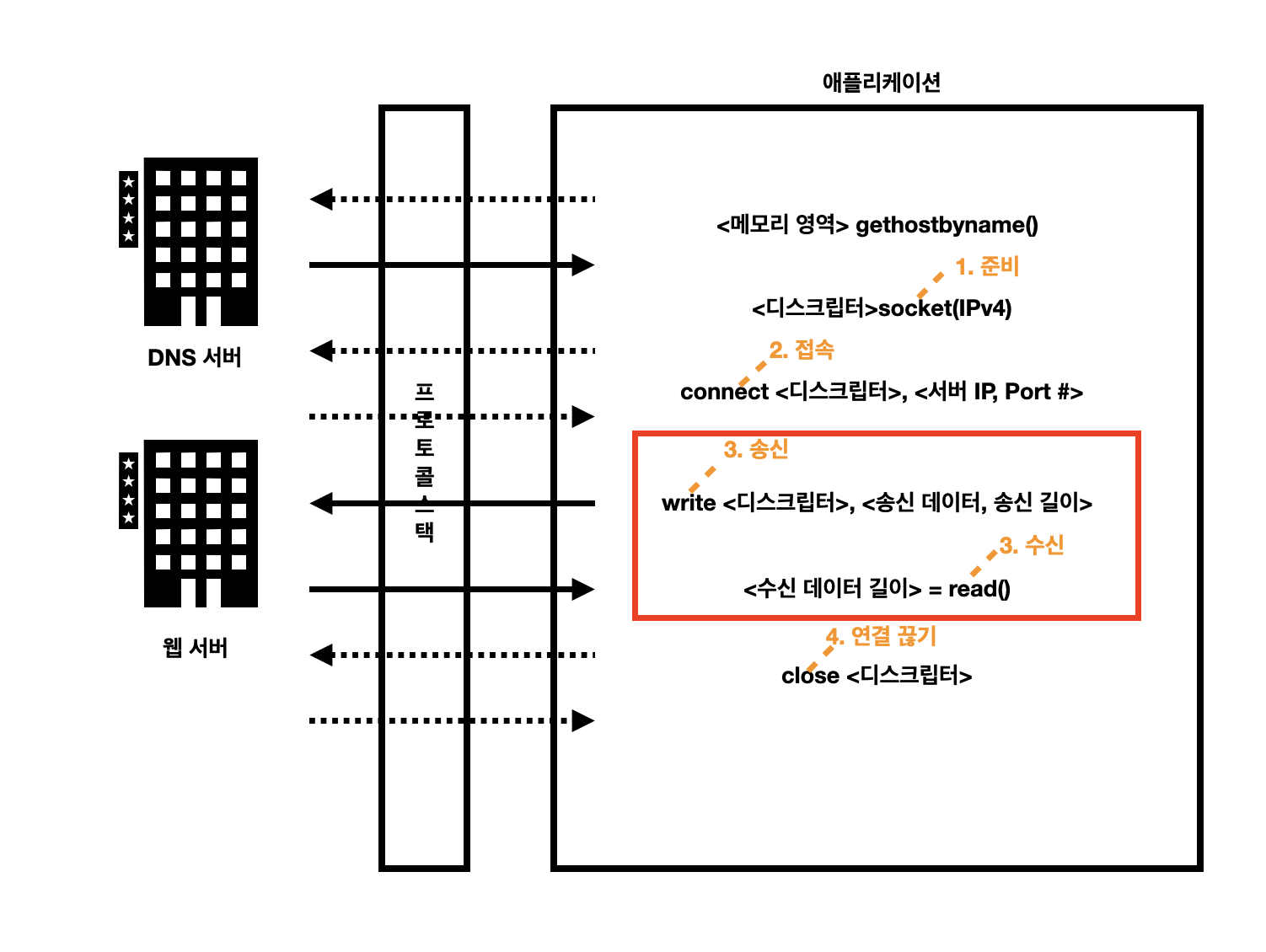 여기에서도 DNS 서버에 IP 주소를 조회할 때와 같이 Socket 라이브러리에 들어있는 메서드들을 이용하는데, IP 주소를 조회할 때 처럼 하나씩 호출하고 끝나지는 않는다. 많은 메서드들을 결정된 순번대로 호출해야 하므로 복잡한 과정을 거친다. 즉, OS 내부의 프로토콜 스택에 메시지 송신을 의뢰할 때는 Socket 라이브러리 프로그램 메서드를 결정된 순서대로 호출한다.