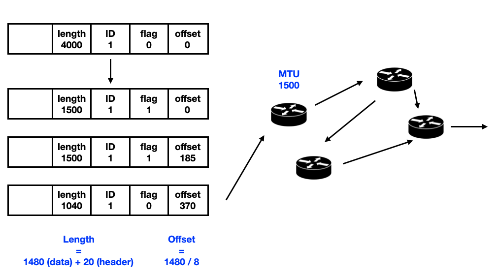 인터넷 계층은 전송 계층으로 부터 받은 세그먼트에 IP 헤더를 붙인다. IP 헤더에는 Packet Length, Header Checksum, Source IP, Destinaition IP, Identification, Fragments offset 등이 기록된다. 인터넷 계층에도 전송 계층과 마찬가지로 해당 계층의 MTU를 넘어선 패킷을 전송할 수 없다. MTU는 계층마다 다르다. 그렇기 때문에 거치는 라우터 마다 전송에 적합한 데이터 링크 계층 프레임으로 변환이 필요하다. IPv4에서는 발신지 뿐만 아니라 중간 라우터에서도 IP 단편화가 가능하다.
