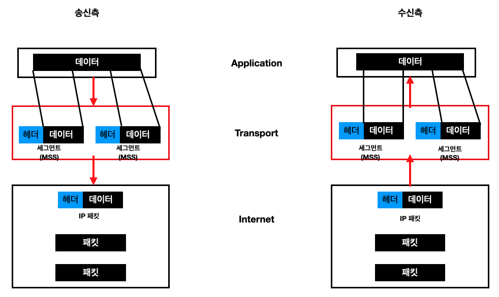 그러면 전송 계층의 TCP 프로토콜이 응용 계층의 데이터 단위인 메시지를 받아 작은 조각으로 분할한다. 해당 데이터 단위를 세그먼트(segment)라고 한다. 즉, TCP 프로토콜에 따라 분할된 데이터에 TCP 헤더가 붙어 캡슐화된 전송 계층의 패킷이 세그먼트이다.