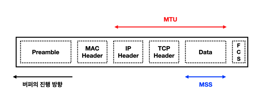 MTU는(Maximum Transmission Unit)의 약자로 한 패킷으로 운반할 수 있는 디지털 데이터의 최대 길이를 말하며, 이더넷에서는 보통 1,500바이트가 된다. MTU에는 패킷의 맨 앞부분에 헤더(TCP, IP)가 포함되어 있으므로, 헤더부를 제외한 부분이 하나의 패킷으로 운반할 수 있는 데이터의 최대 길이가 되며 이를 MSS(Maximum Segment Size)라고 한다.