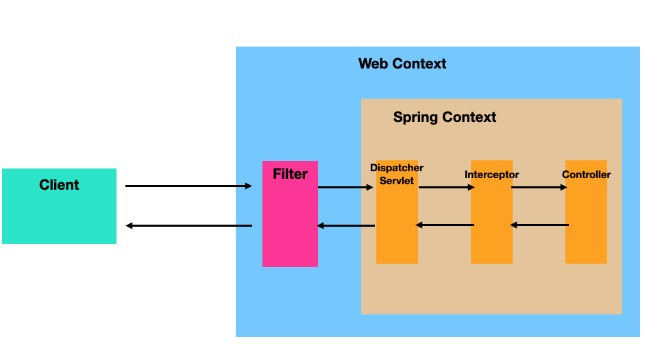 필터는 서블릿 컨텍스트에 등록하고, 인터셉터는 스프링 컨텍스트에 등록한다.