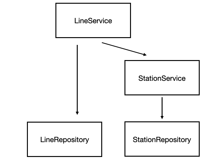 현재 지하철 애플리케이션에는 지하철 노선과 관련된 비즈니스 로직을 담당하는 LineService가 있고, 노선의 역과 관련된 비즈니스 로직을 담당하는 StationService가 있다. 각 서비스 계층에 연결된 LineRepository, StationRepository도 함께 존재했다.