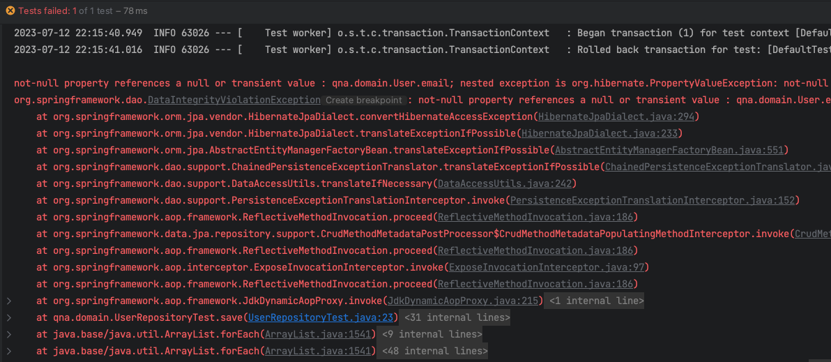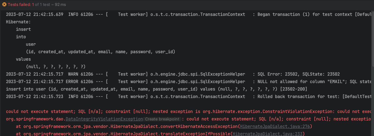 차이점을 알아보기 위해 이전에 User의 email 필드에 null을 세팅한 후 저장하는 테스트 코드를 실행해보겠습니다.