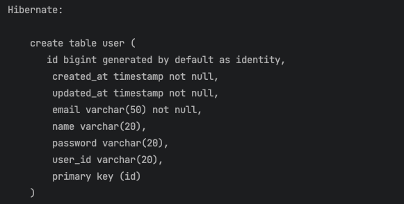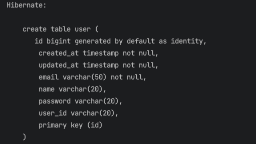 User 테이블의 email 필드는 반드시 값이 존재해야 합니다. 즉, NOT NULL 제약 조건이 필요합니다. 여기서 JPA가 자동으로 생성하는 DDL을 확인해 보겠습니다.