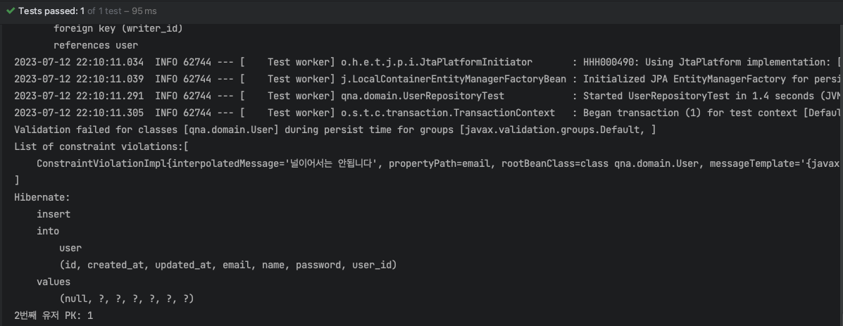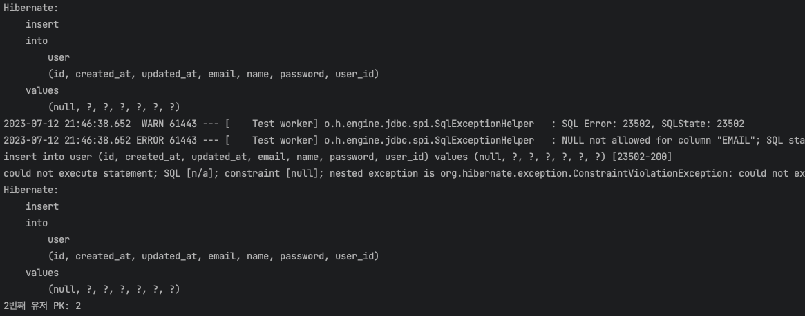 첫 번째 유저를 저장할 때는 email 값을 null로 할당한 후 try - catch를 이용해 예외를 삼키고, 두 번째 유저는 정상적으로 저장한 후 PK를 출력해 봤습니다. 예상한 것처럼, 두 번째 유저의 PK는 2 임을 확인할 수 있습니다.