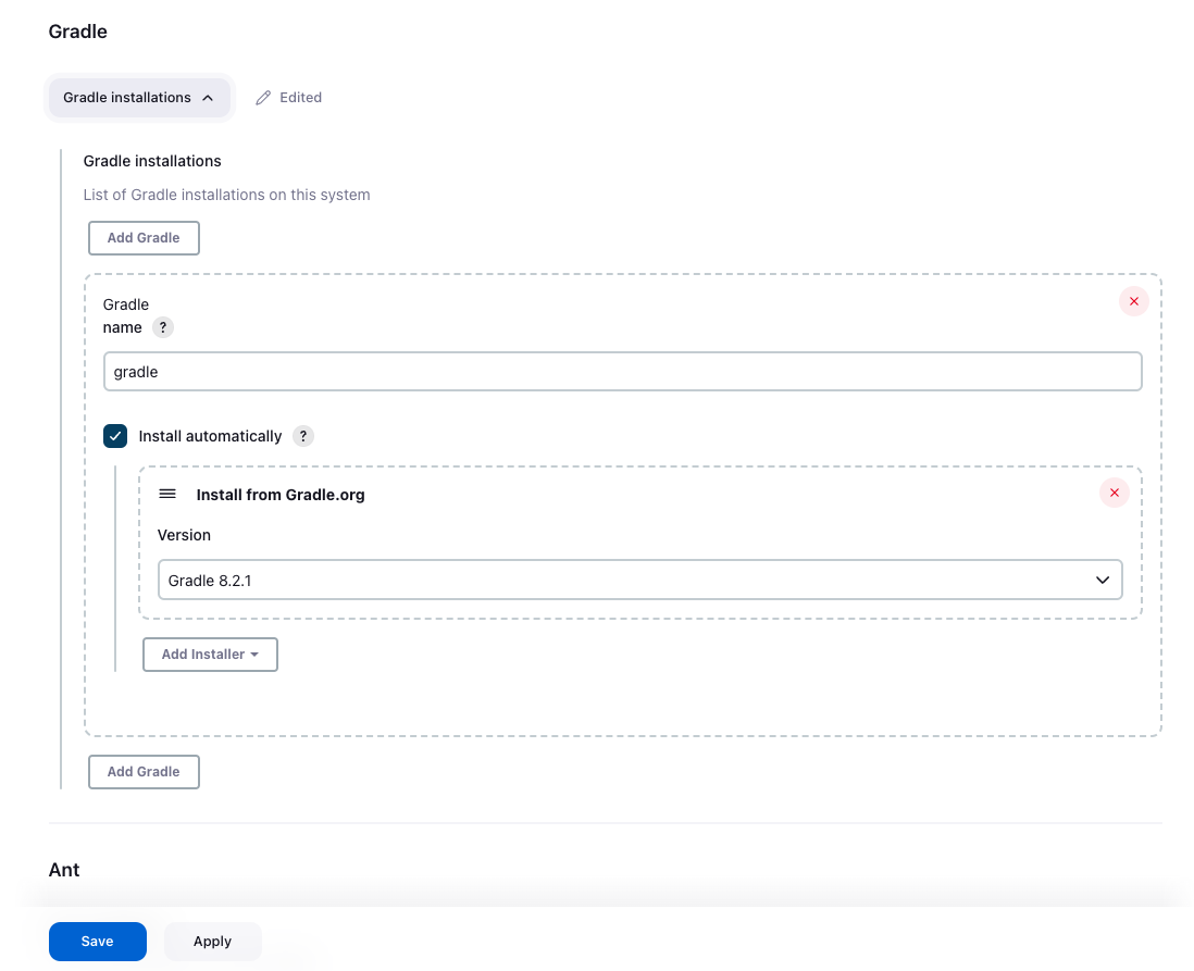 젠킨스 메인 화면에서 대시보드 -> 젠킨스 관리 -> Tools를 누르면 아래와 같은 Gradle 설정 화면을 볼 수 있습니다.