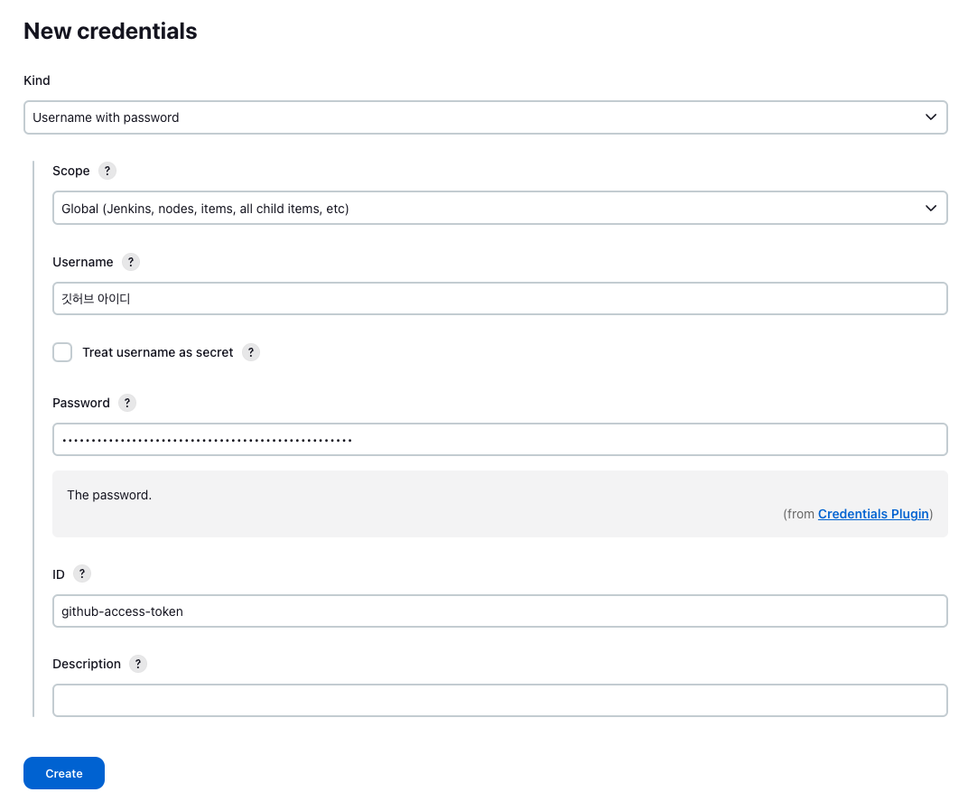 id는 깃허브 크리덴셜과 마찬가지로 식별자이기 때문에 원하는 값을 입력하면 됩니다.