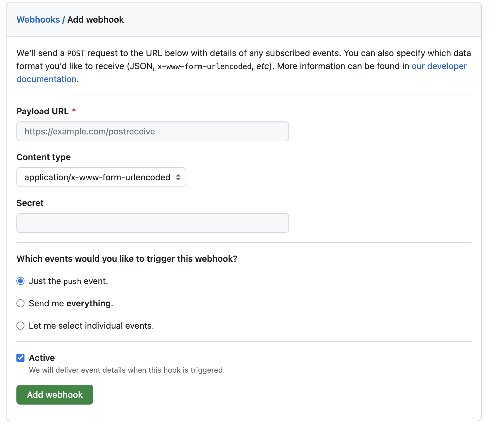 그러면 아래와 같은 Payload URL, Content Type, Secret을 입력하는 폼이 나타납니다.