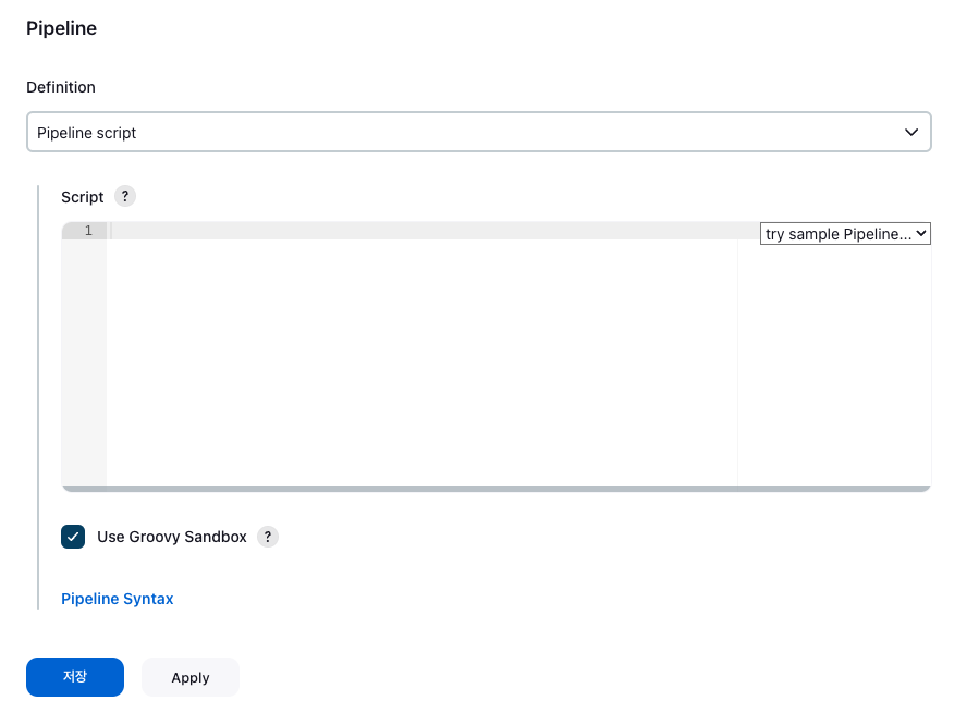 여기서 저장 버튼 위에 보이는 Pipeline Syntax를 누르면 깃허브를 이용해 접근할 수 있는 스크립트를 생성하는 화면이 나옵니다.