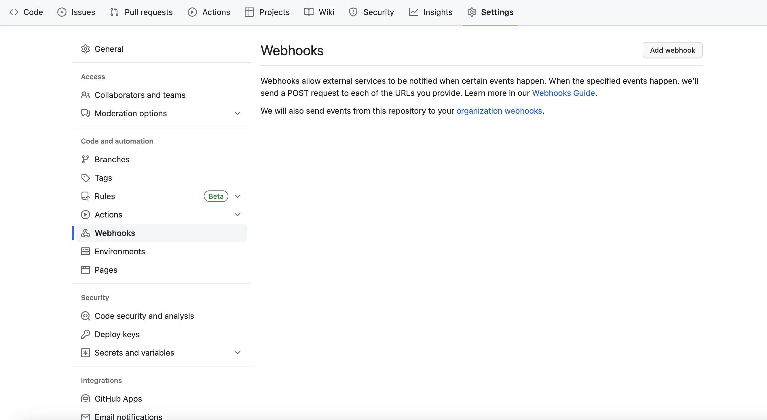 레포지토리의 Settings를 눌러서 접속할 수 있습니다. 이후 왼쪽 메뉴바에 Webhooks를 누르면 아래와 같은 화면을 볼 수 있습니다.