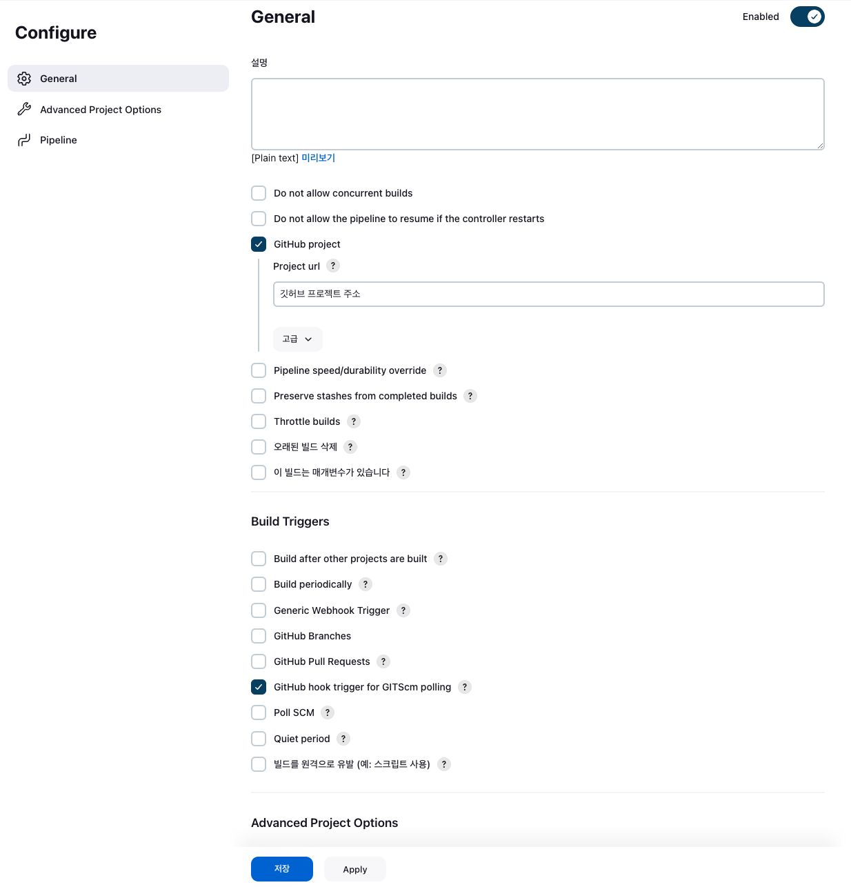 저희는 깃허브 프로젝트를 사용하고 있기 때문에 Github Project를 체크한 후 레포지토리의 url을 입력합니다.