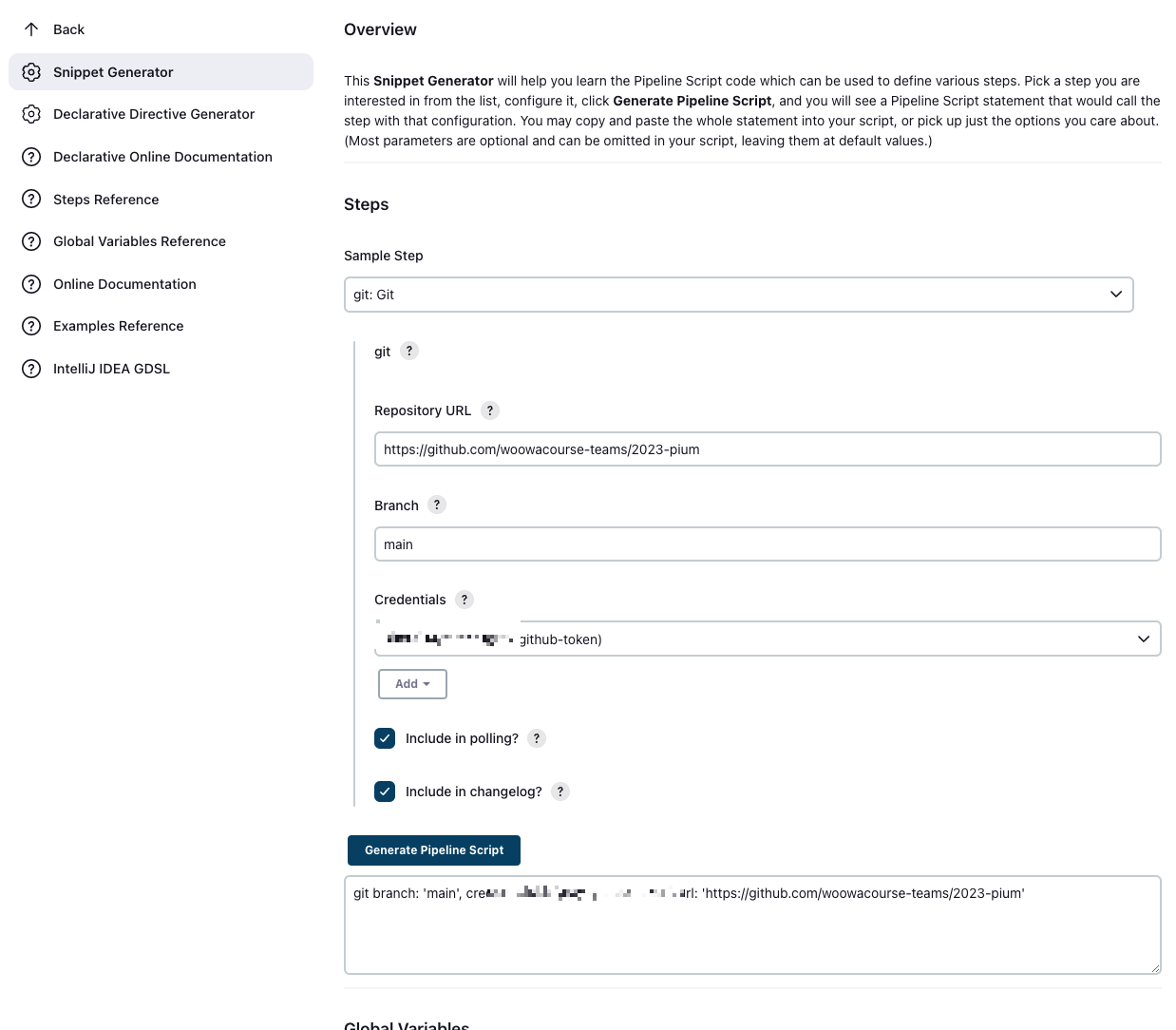 모두 입력했다면 Generate Pipeline Script를 눌러 완성된 스크립트를 확인합니다.