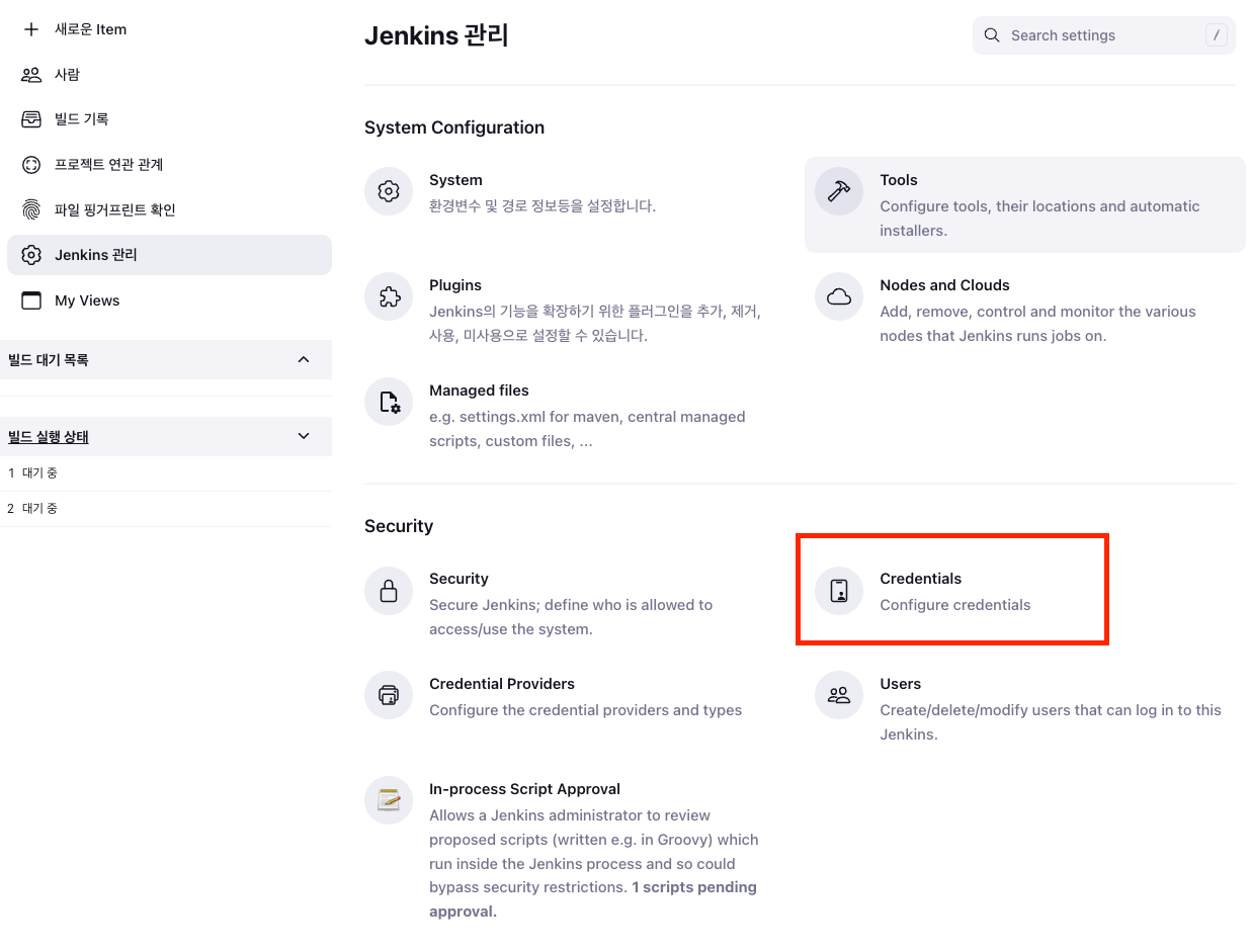 젠킨스 메인 화면에서 Jenkins 관리 페이지로 접속하면 Security 탭에 Credentials를 눌러 접속합니다.