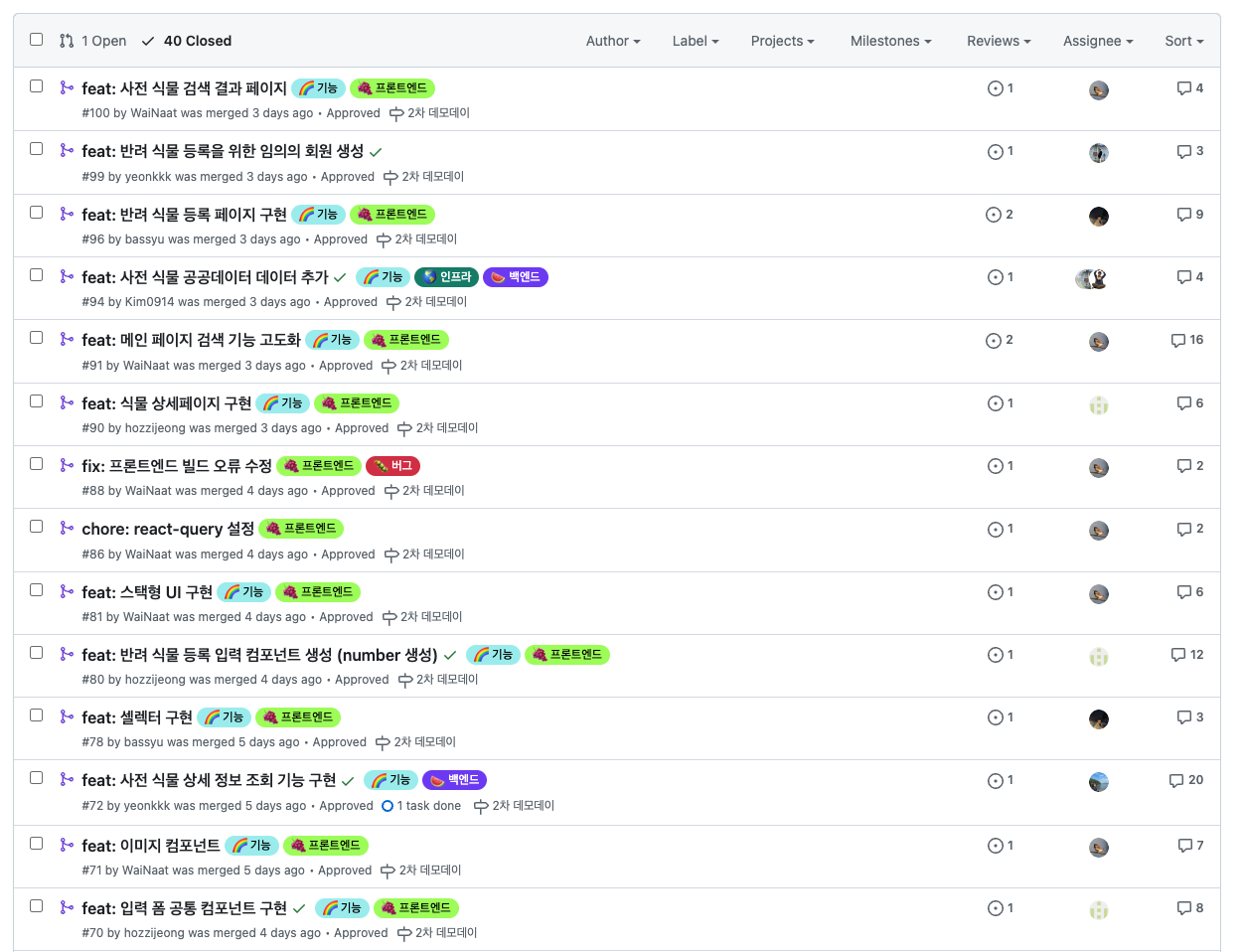 피움 팀 프론트엔드와 백엔드가 2주간 완료한 PR 목록이다. (주노의 회고글을 보고 나도 올려본다)