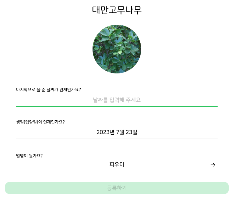 원하는 식물을 클릭하면 반려 식물을 등록하는 화면이 나온다.