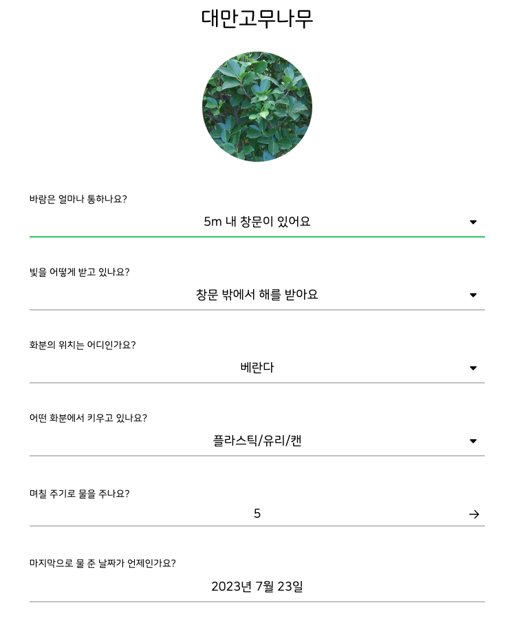 키우고 있는 식물 이름을 입력하면 검색과 동일하게 리스트로 나온다.