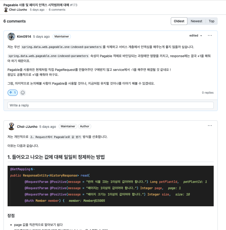 페이징 인덱스는 어떤 방식으로 가져갈지, 페이징 쿼리는 어떻게 받아오는 게 좋을지 사소한 것 모두 디스커션에 남기고 의견을 모았다.