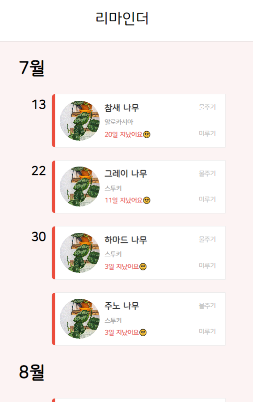 리마인더에서 물 주기 버튼을 클릭해 물 주기를 완료하면 자동으로 반려 식물의 타임라인이 기록된다.