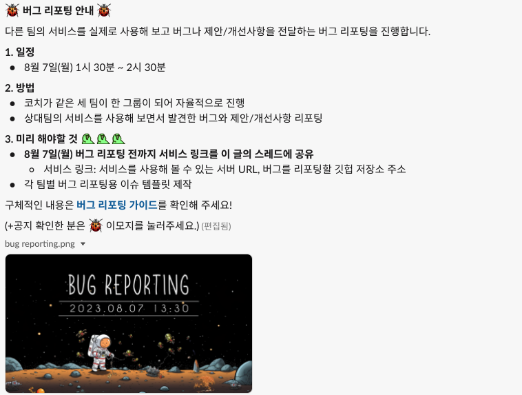 같은 그룹인 보투게더, 코끼리끼리 팀과 함께 버그 리포팅을 했고 우리 팀에서 예상하지 못했던 부분들을 확인할 수 있었다.