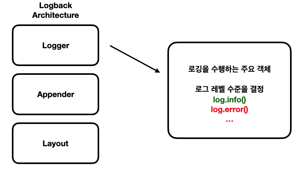 Logback 설정을 하기 전, 구조를 간단하게 살펴보면 Logback은 크게 3가지 Logger, Appender, Layout의 구성 요소를 가지고 있습니다.