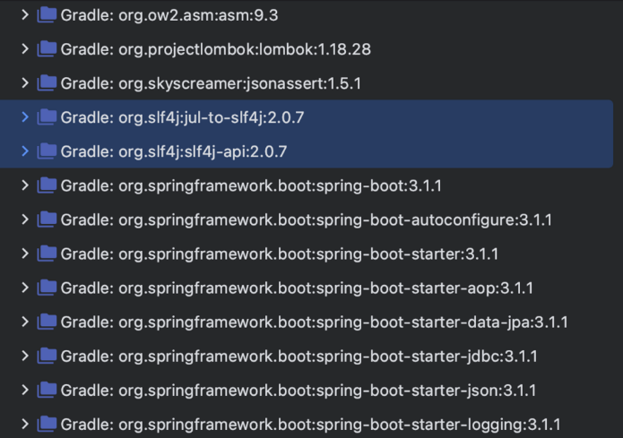스프링 부트는 기본적으로 Logback 설정이 되어 있습니다. 라이브러리를 살펴보면 slf4j를 사용하고 있음을 확인할 수 있습니다.
