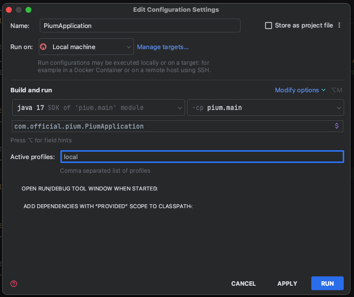 만약 local로 profile을 설정한 경우에는 인텔리제이에서 아래와 같이 설정해야 콘솔 로그를 확인할 수 있습니다.