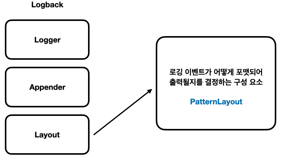 Layout은 로깅 이벤트가 어떻게 포맷되어 출력될지 결정하는 구성 요소입니다. 사용자가 지정한 형식으로 로그 메세지를 변환한다는 것을 의미합니다. 예를 들어 자바에서 문자열 포맷팅과 비슷하다고 할 수 있습니다.