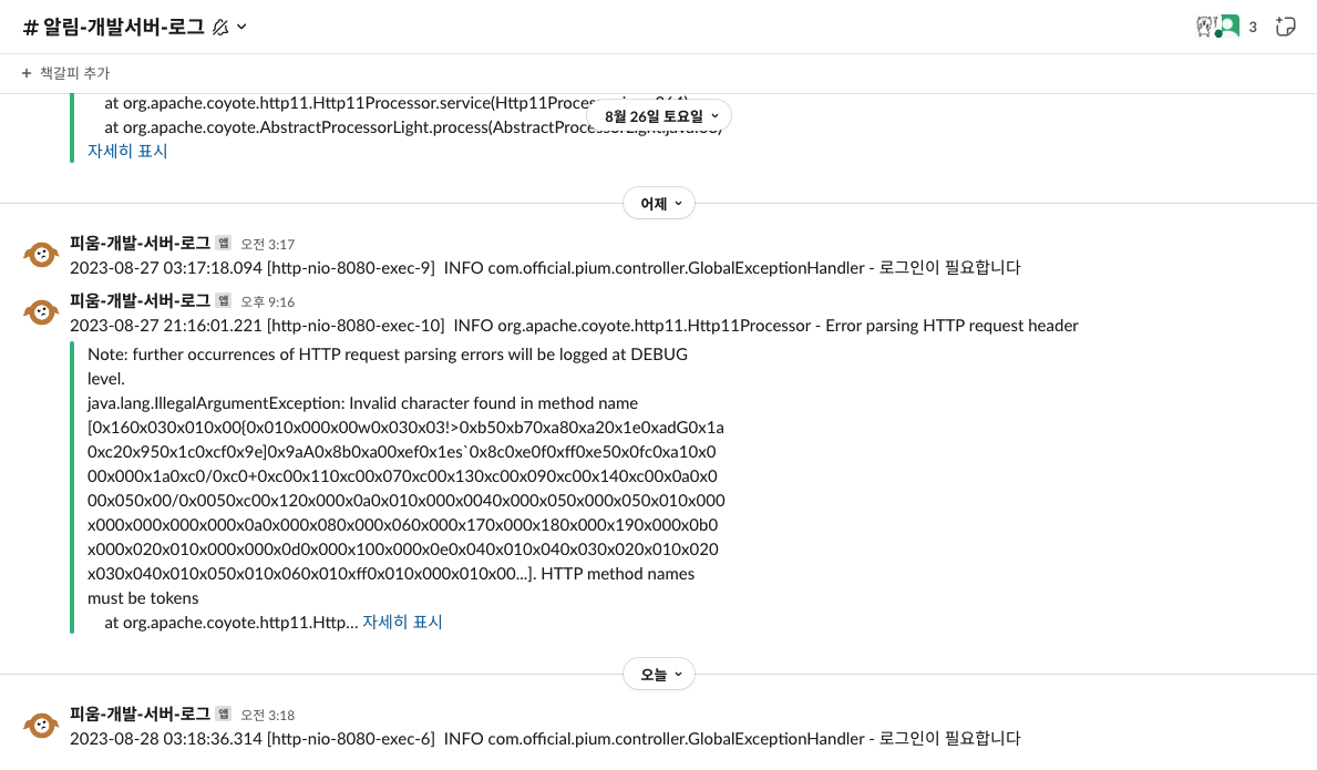 슬랙 알림의 경우에는 요구 사항에는 존재하지 않았지만, 개발을 진행하면서 팀원들이 로그를 확인해야 되는 상황이 종종 발생했다. 현재 우테코에서 제공하는 서버는 캠퍼스 내에서만 접속할 수 있기 때문에 외부에서는 확인할 수 없다. 그래서 추가적으로 개발 서버의 INFO 레벨도 슬랙으로 확인할 수 있도록 설정했다. INFO 레벨부터 로깅하기 때문에 꽤 많은 알람이 발생하지만 개발 서버는 운영 서버에 비해 비교적 자주 사용하지 않고, 팀원들만 사용하기 때문에 큰 무리는 없었다.