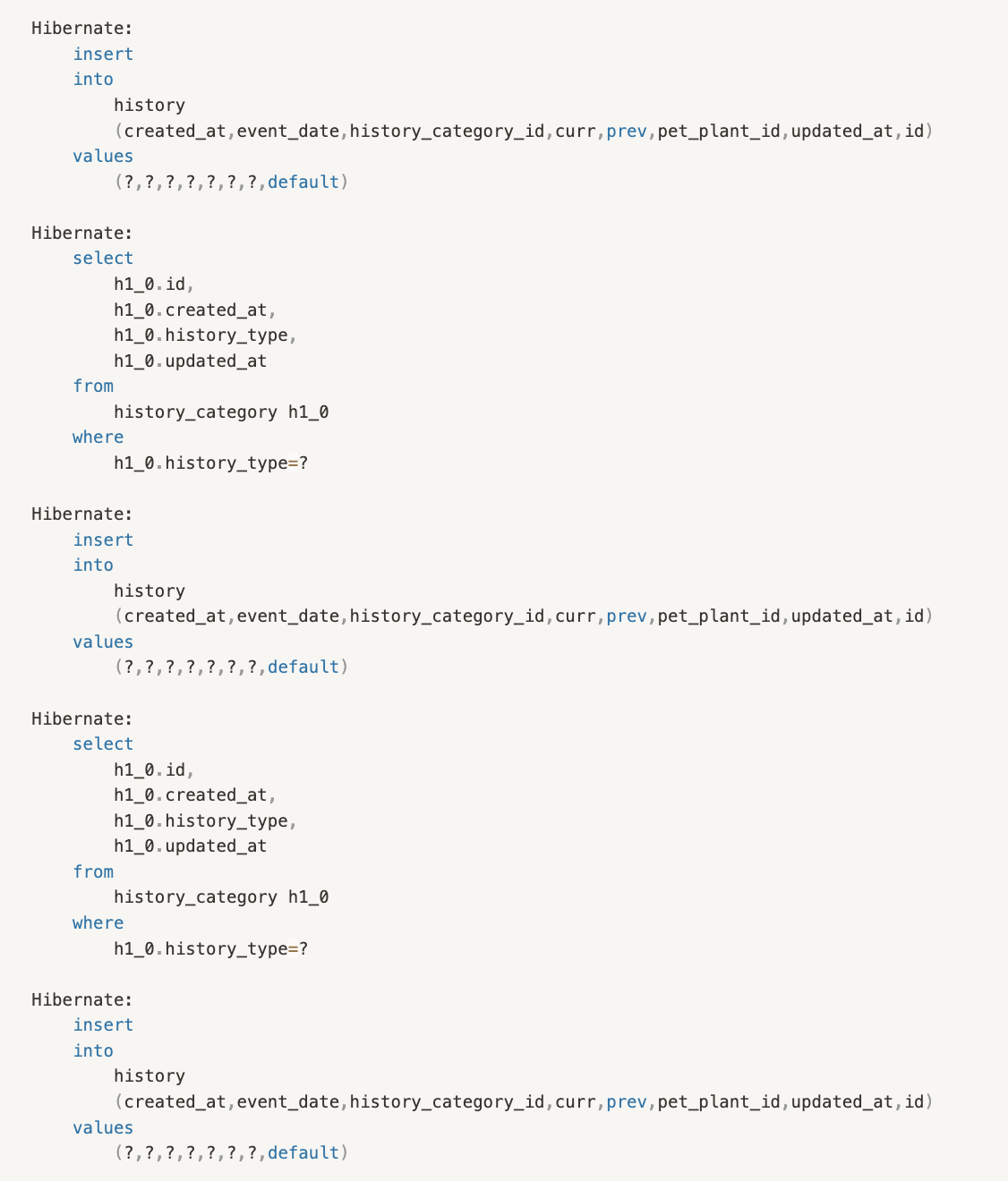 반려 식물을 생성, 환경 변화, 물 주기 등 반려 식물과 관련된 이벤트가 발생했을 때 히스토리를 저장하고 있고, 한 동작에서 여러 히스토리가 생성되고 있습니다. 히스토리를 저장할 때 어떤 히스토리인지 히스토리 카테고리를 이용해 구분합니다. 이때 해당 카테고리가 DB에 존재하는지 확인하고 저장하기 때문에 카테고리 조회가 발생합니다. 현재 카테고리가 총 6개 존재하고 요구사항으로 카테고리가 추가적으로 생길 가능성이 많고 그에 따라 발생하는 쿼리는 증가할 것입니다.