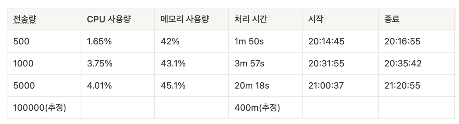- 알림 10만 개가 동시에 일어난다고 가정했을 때, 총 처리시간이 400분 걸림