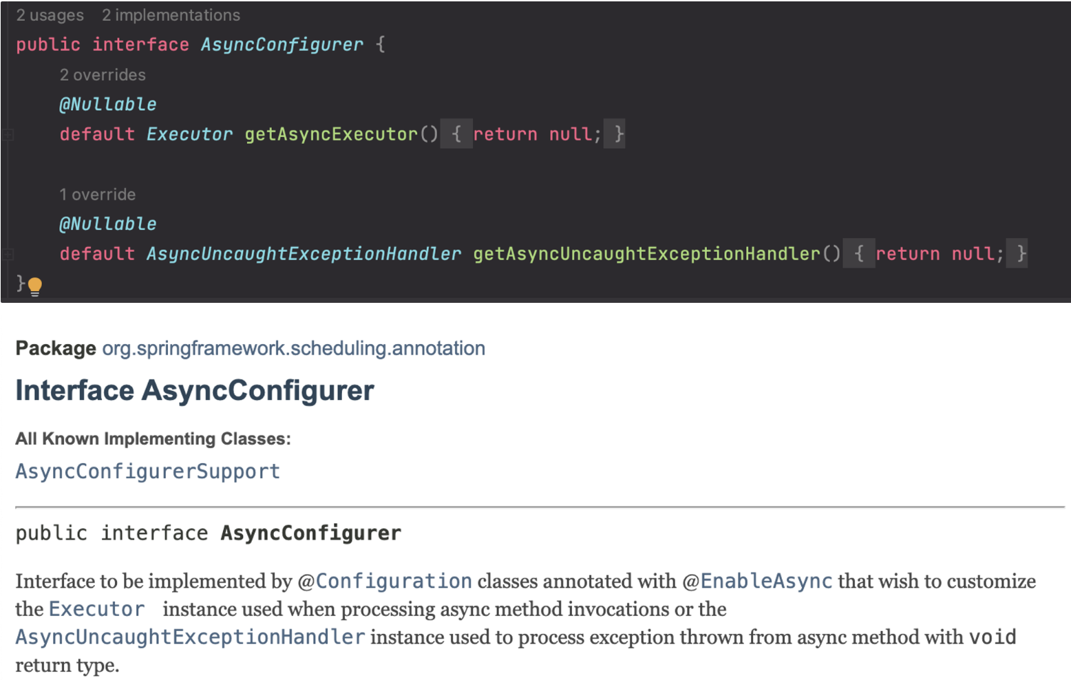 스프링에서는 AsyncConfigurer 를 통해 비동기 메소드 호출 처리시 사용되는 Executor 인스턴스를 커스터마이징하는 설정자를 제공한다. 사용법이 친절하게 공식 문서에 기술되어 있다. @EnableAsync 어노테이션 처리된 @Configuration 클래스로 이 메소드를 구현하면 된다.