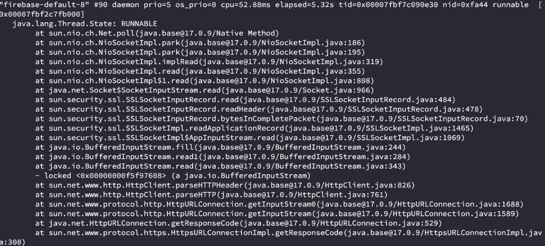 먼저 스레드 덤프를 통해 확인해보니 알림 요청이 오기 전에는 비동기 스레드가 생성되지 않다가, 알림 요청이 온 이후에야 스레드가 생성 후 RUNNABLE 상태가 되는 것을 파악했다.
