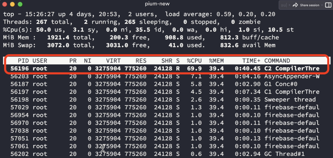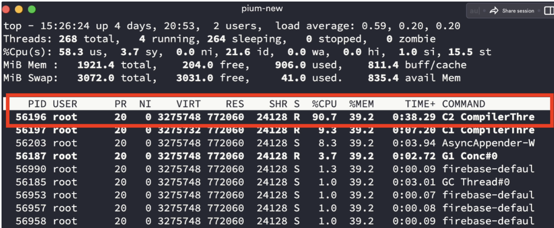따라서 리눅스의 top-H 명령어를 통해 각 스레드의 CPU 사용량을 체크해 보았다.