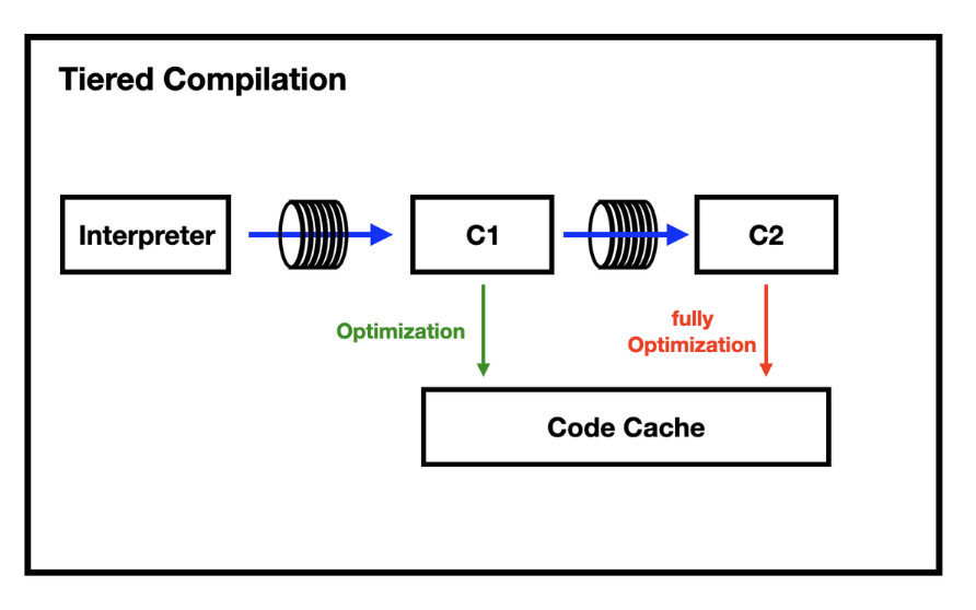 인터프리터를 통해 바이트 코드가 기계어로 번역된다. 해당 메서드가 정해진 임계치 만큼 호출되면 C1 컴파일러를 통해 간략한 최적화를 진행한다. 이후 C2 컴파일러의 임계치 만큼 호출되면 최대 최적화를 진행한다.