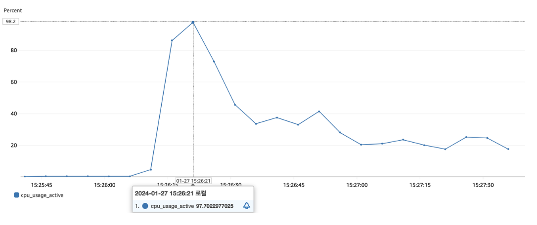 하지만, 여전히 CPU 사용량은 초반 99%까지 튀어오르는 것을 볼 수 있었다.