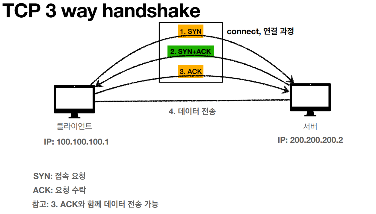 - 연결지향 - TCP 3 way handshake (가상 연결)
