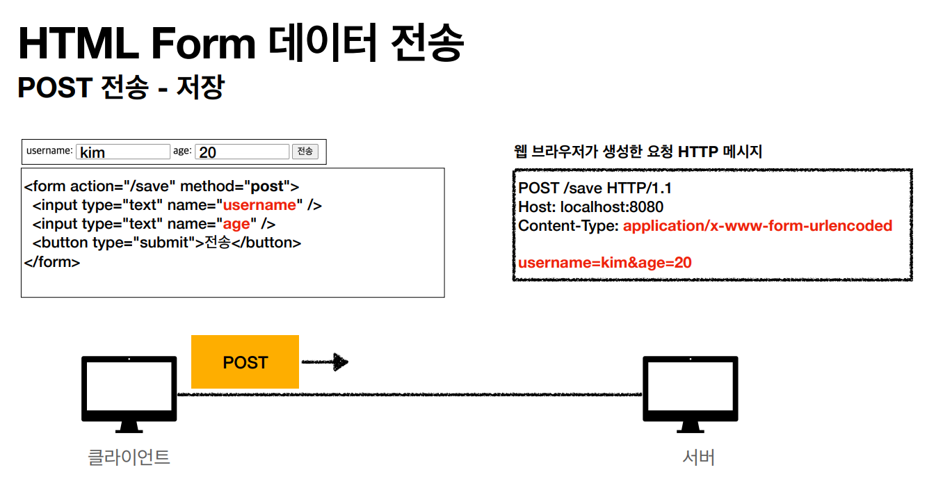 - form의 내용을 메시지 바디를 통해서 전송(key=value, 쿼리 파라미터 형식)