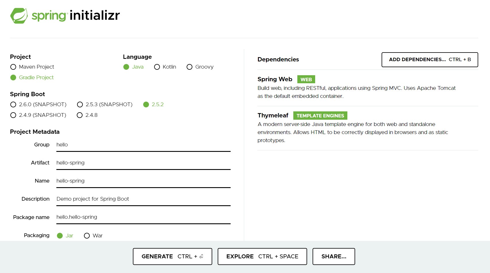 스프링 부트 스타터 사이트로 이동해서 스프링 프로젝트 생성