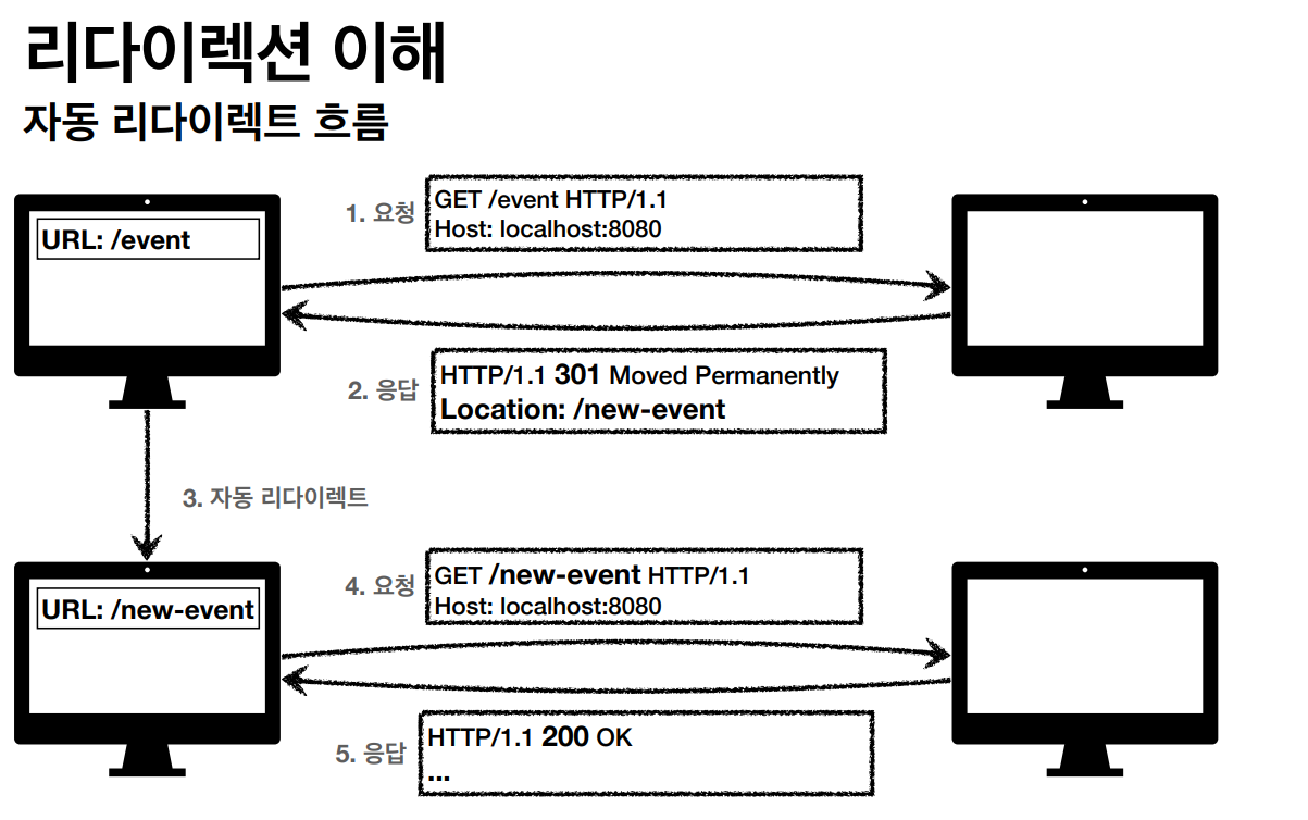 • 301 Moved Permanently: 리소스의 URI가 영구적으로 이동. 리다이렉트시 요청 메서드가 GET으로 변하고 본문 제거