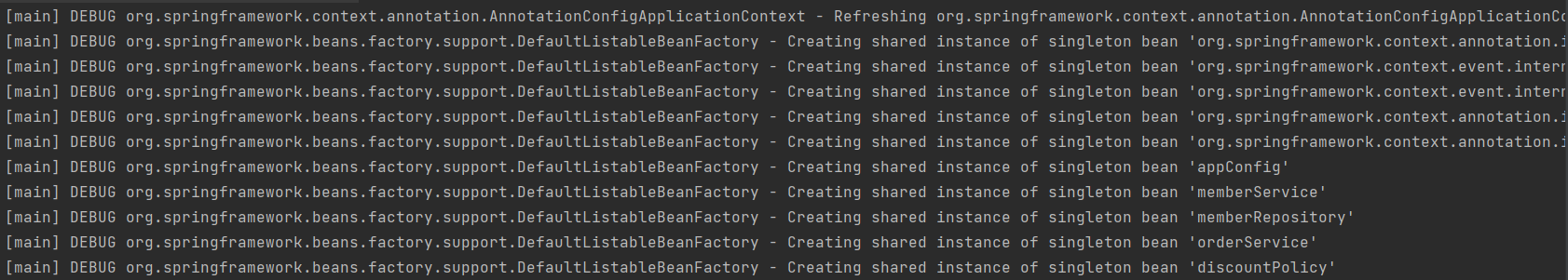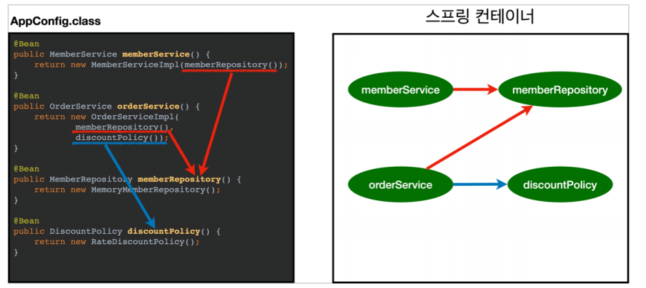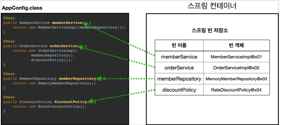 다른 메소드들도 동일하게 빈을 등록하는 과정에서 스프링 컨테이너 내부에 자동으로 빈 의존관계를 매핑한다.