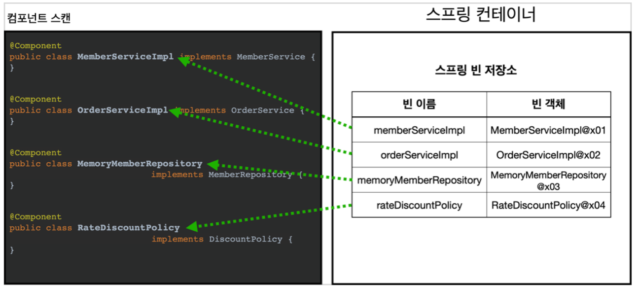 컴포넌트 스캔의 역할은 '컴포넌트 스캔' 말 그대로 @Component가 붙은 클래스를 스캔해서 스프링 빈으로 등록한다.