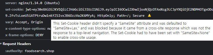 그러나,, 해당 설정을 완료했음에도 불구하고 브라우저에서는 여전히 SameSite 경고를 발생시켰다.... 현재 nginx 기반의 웹서버를 사용하고 있기에 다른 블로그에서 제시한 방법인 Nginx Config 파일의 location에 proxy_cookie_path / "/; secure; SameSite=None"; 설정을 추가해줬지만 여전히 SameSite 경고가 나왔다...