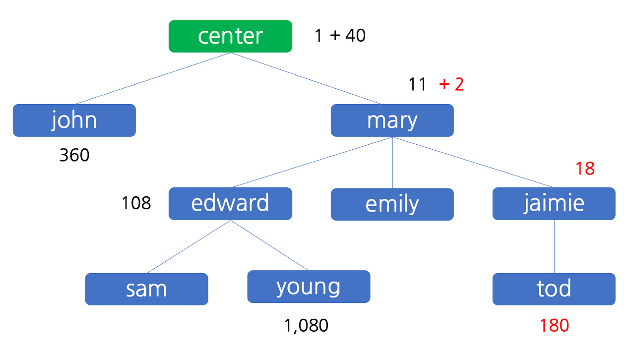 또 그 후에는 판매원 tod 에 의하여 200 원 이익이 발생하는데, tod 자신이 180 원을, 추천인인 jaimie 가 그 중 10% 인 20 원을 받아서 18 원을 가지고, jaimie 의 추천인인 mary 는 2 원을 받지만 이것의 10% 는 원 단위에서 절사하면 배분할 금액이 없기 때문에 mary 는 2 원을 모두 가집니다. 이 상태를 그림으로 나타내면 아래와 같습니다.