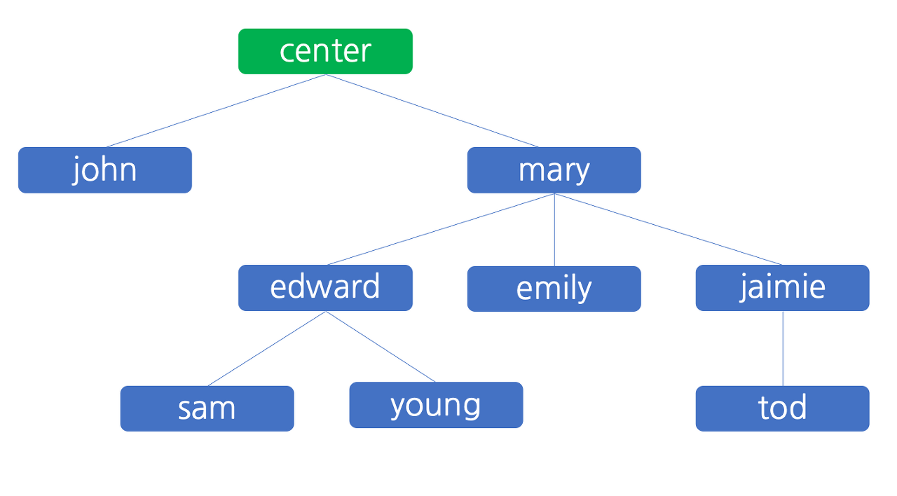 그 다음으로 emily 가 칫솔 판매를 통하여 얻은 이익 500 원은 마찬가지의 규칙에 따라 emily 에게 450 원, mary 에게 45 원, 그리고 센터에 5 원으로 분배됩니다. 이 상태를 그림으로 나타내면 아래와 같습니다.